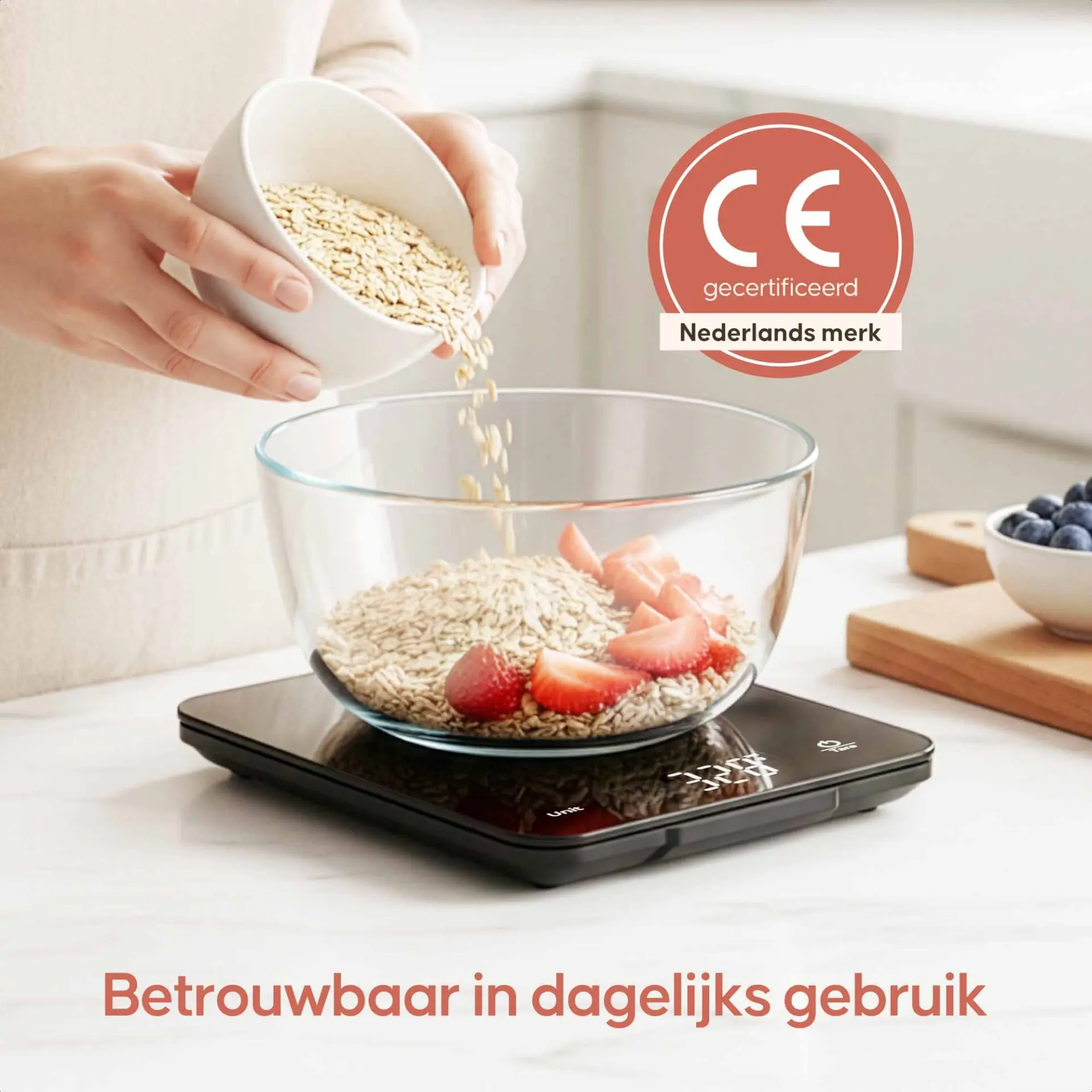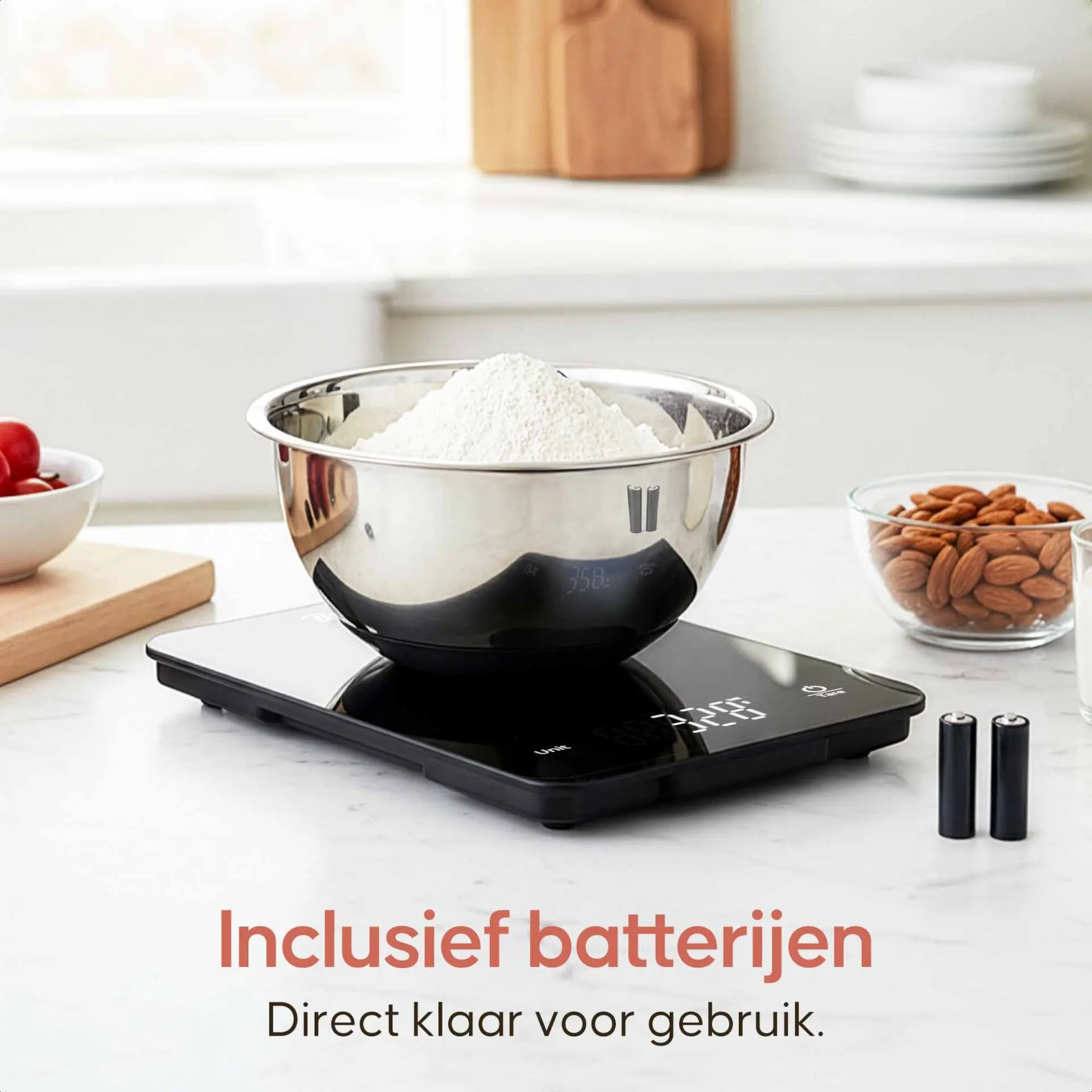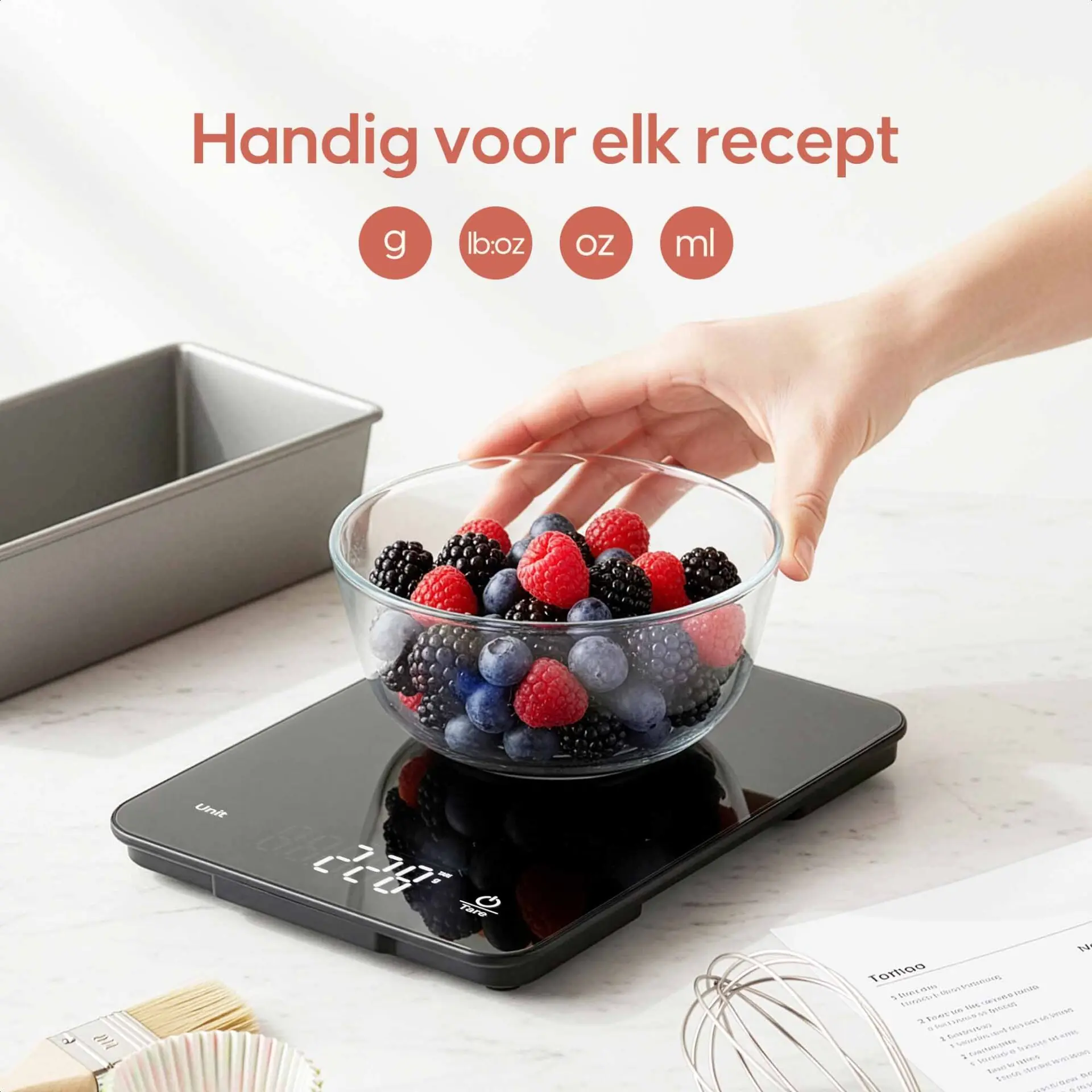 Eenvoudig in gebruik: Plaats je kom of schaal op de weegschaal en reset het gewicht met één druk op de knop. De tarrafunctie maakt het mogelijk om meerdere ingrediënten in dezelfde kom te wegen zonder telkens opnieuw te moeten beginnen.