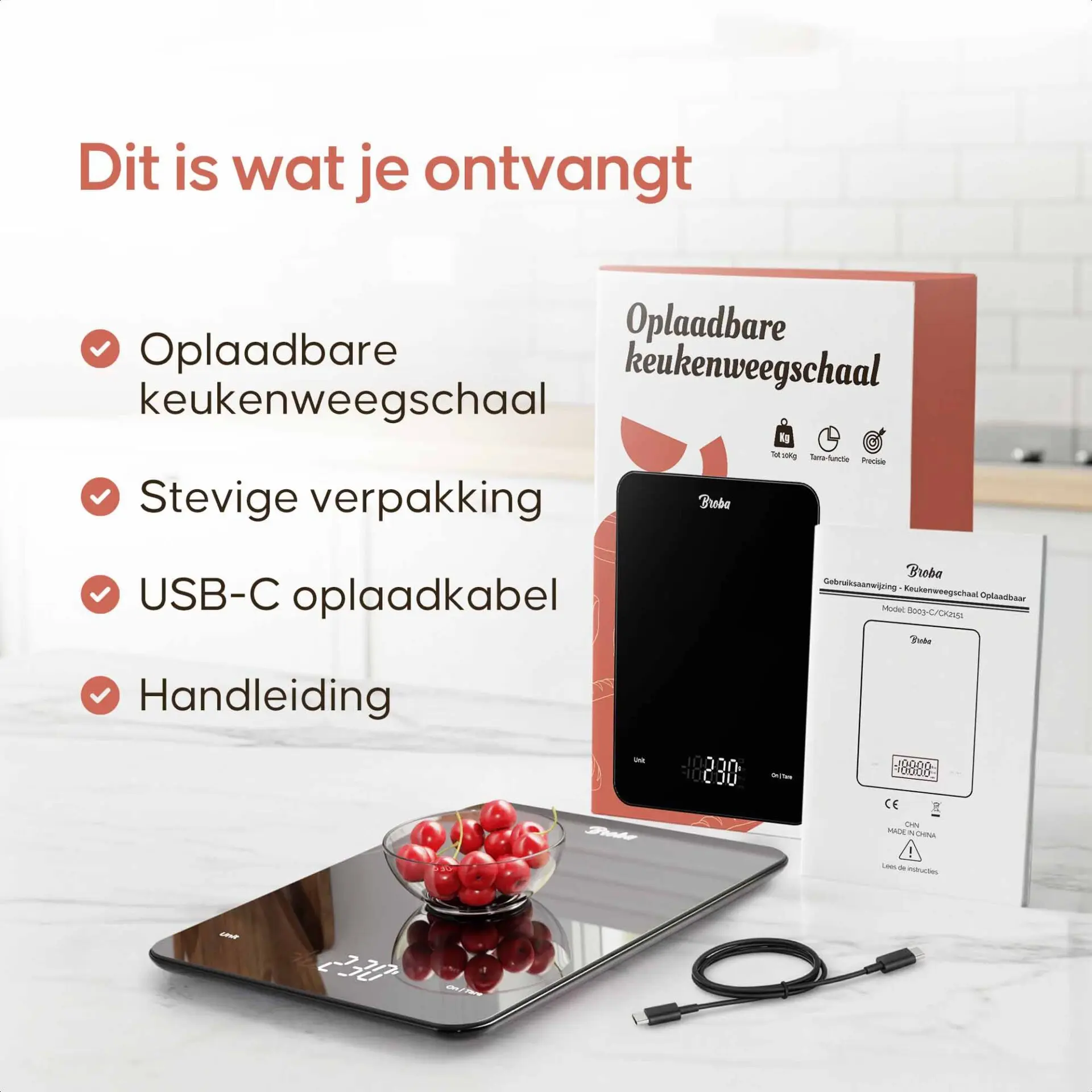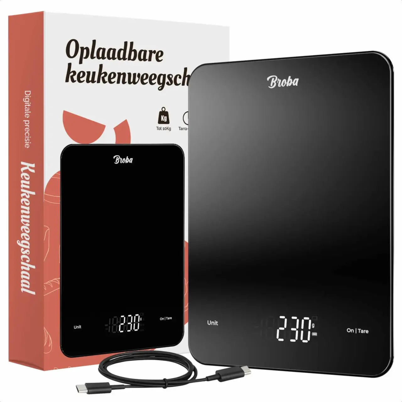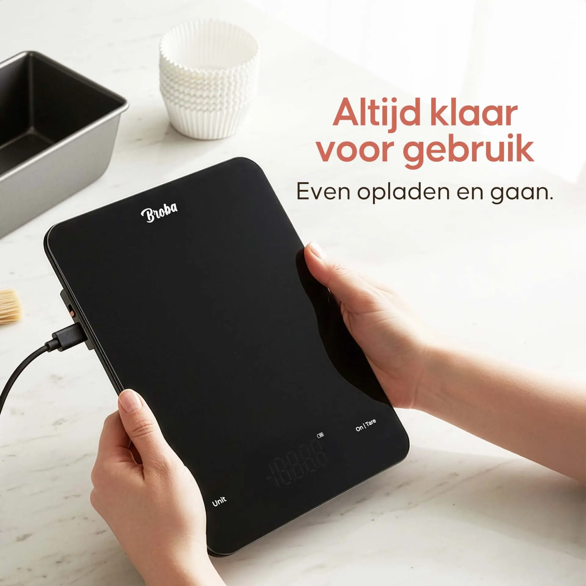 Breng de bakkerij naar jouw keuken met de oplaadbare digitale keukenweegschaal van Broba, jouw vertrouwde partner in de keuken.