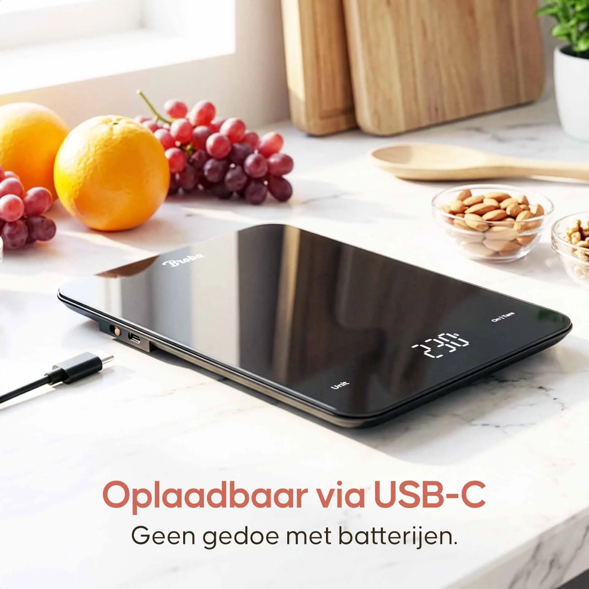 Eindeloos bakplezier zonder onderbreking: Met de oplaadbare functie van de oplaadbare keuken weegschaal zeg je vaarwel tegen het constant wisselen van batterijen. Geniet van langdurige baksessies met de zekerheid dat je weegschaal altijd klaar is voor gebruik.