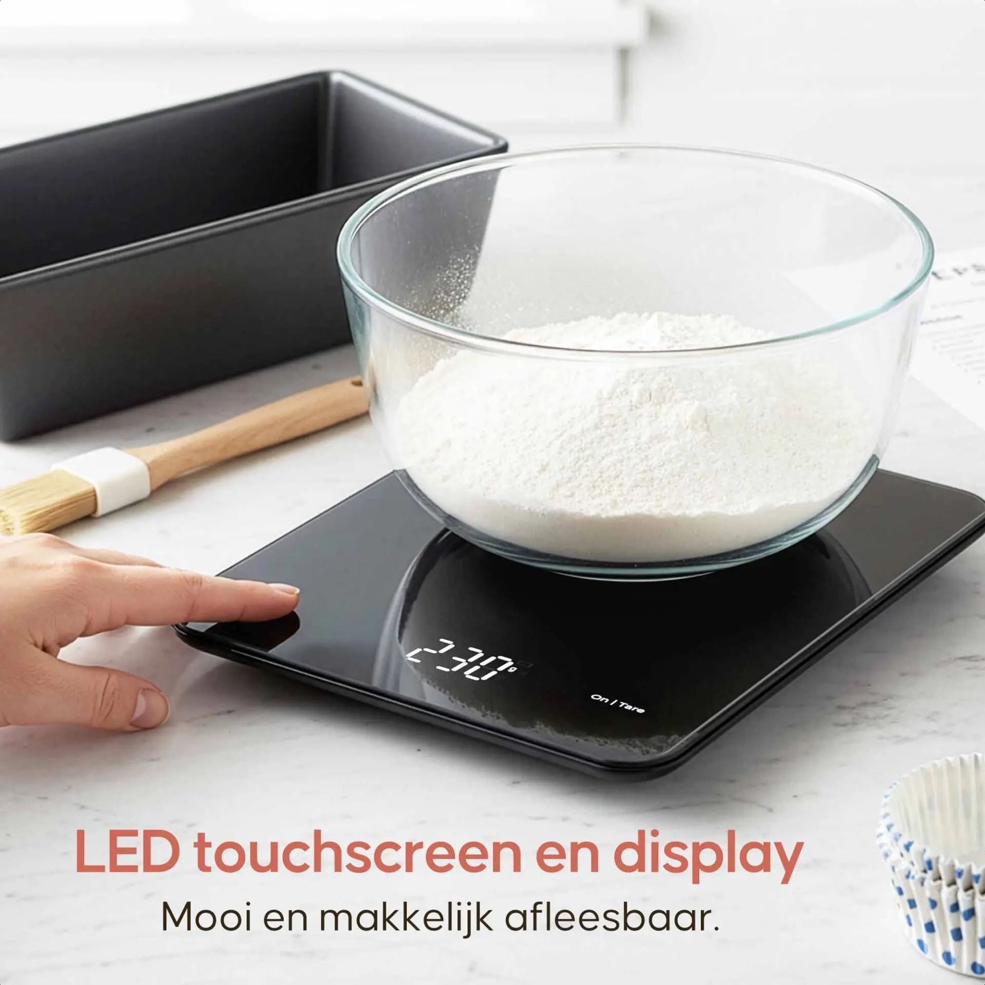 Precisie tot op de gram: Of je nu delicate ingrediënten afweegt voor macarons of de massa voor een stevig brood, deze keukenweegschaal garandeert nauwkeurigheid tot op de gram voor al je bakprojecten, groot of klein.