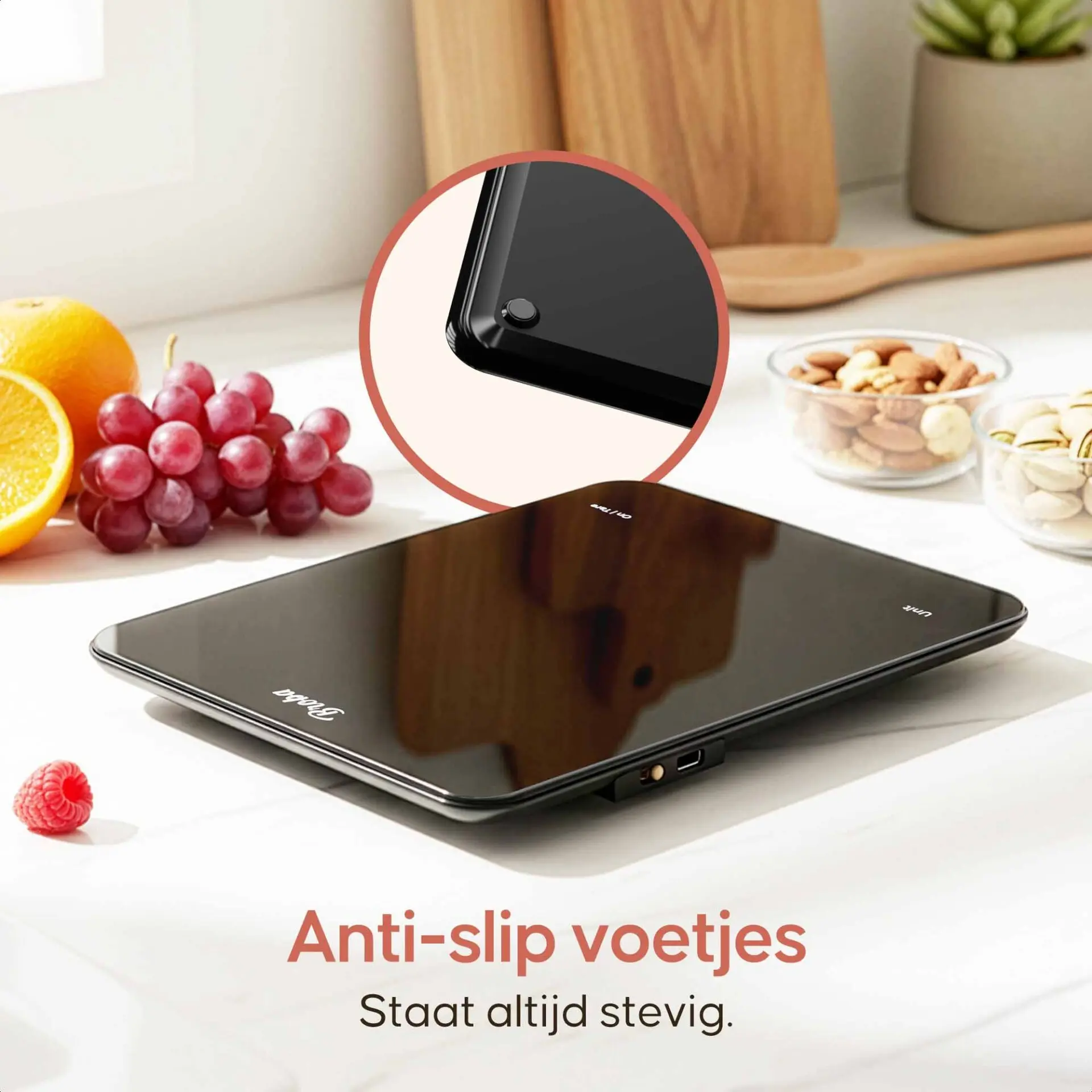 Past perfect in elke keuken: Dit stijlvolle, zwarte ontwerp is niet alleen een lust voor het oog maar ook een wonder van ruimte-efficiëntie. Met zijn slanke afmetingen en lichtgewicht bouw is deze digitale keukenweegschaal eenvoudig op te bergen en te verplaatsen, ideaal voor elke keukenomgeving.