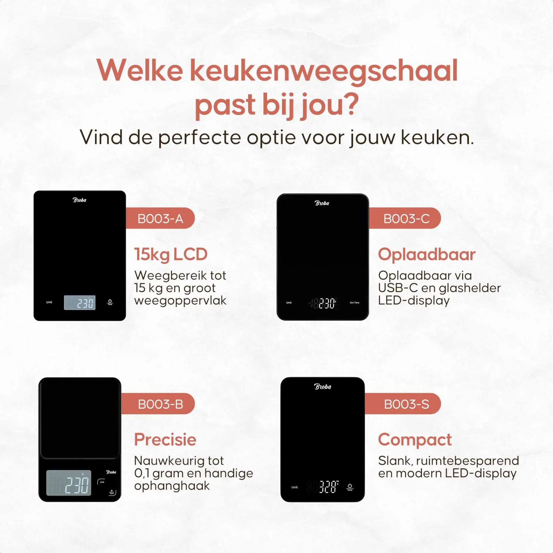 Broba digitale keukenweegschalen onderscheiden zich door hun uitzonderlijke nauwkeurigheid, gebruiksgemak en duurzaamheid. Elk model is ontworpen met de thuisbakker in gedachten, biedt gram nauwkeurige metingen en is uitgerust met functies zoals de tarrafunctie voor het wegen van meerdere ingrediënten. Daarnaast zijn onze weegschalen oplaadbaar en compact, waardoor ze ideaal zijn voor elke keuken.