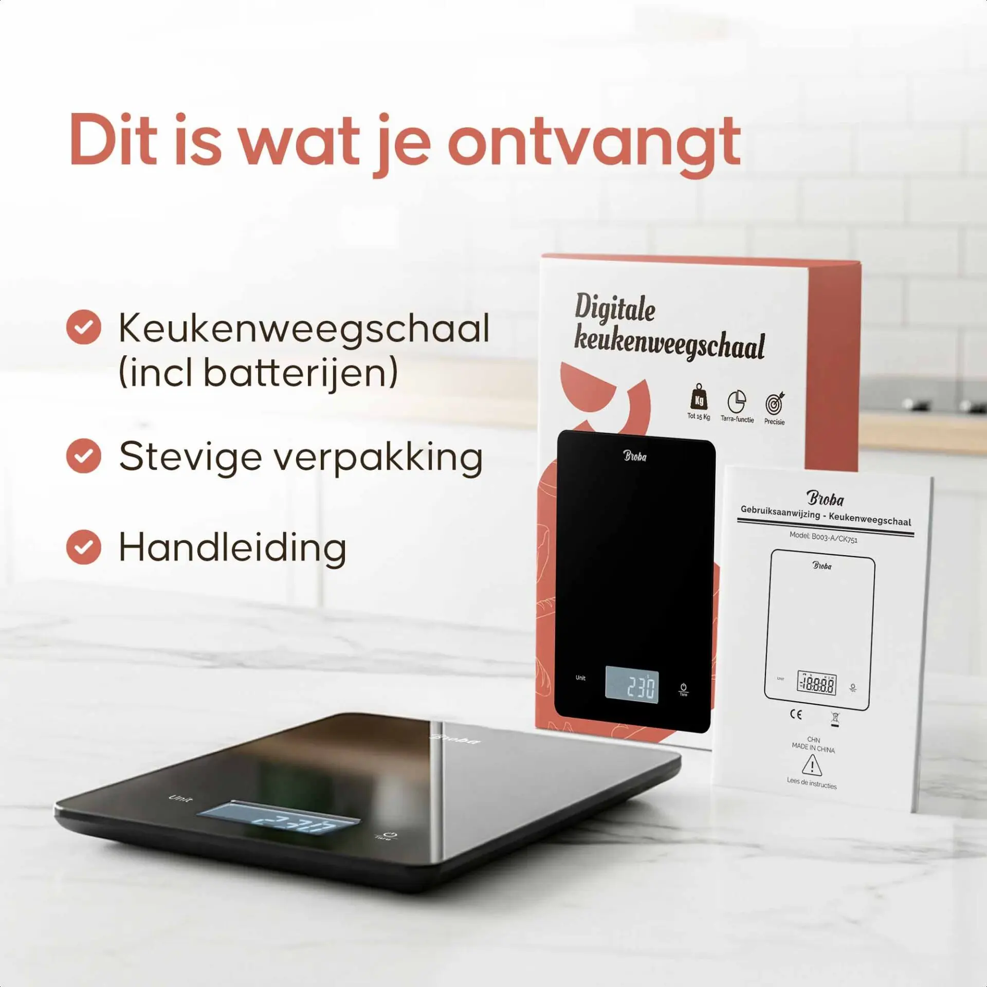 Elk product wordt zorgvuldig ingepakt met een glimlach en de belofte van Broba voor kwaliteit. We gebruiken beschermende verpakkingen om ervoor te zorgen dat je digitale keukenweegschaal veilig en zonder schade aankomt. Bovendien zorgen we ervoor dat alle bestellingen binnen 24 uur verzonden worden, zodat je snel kunt beginnen met het genieten van je nieuwe keukenhulpje.
