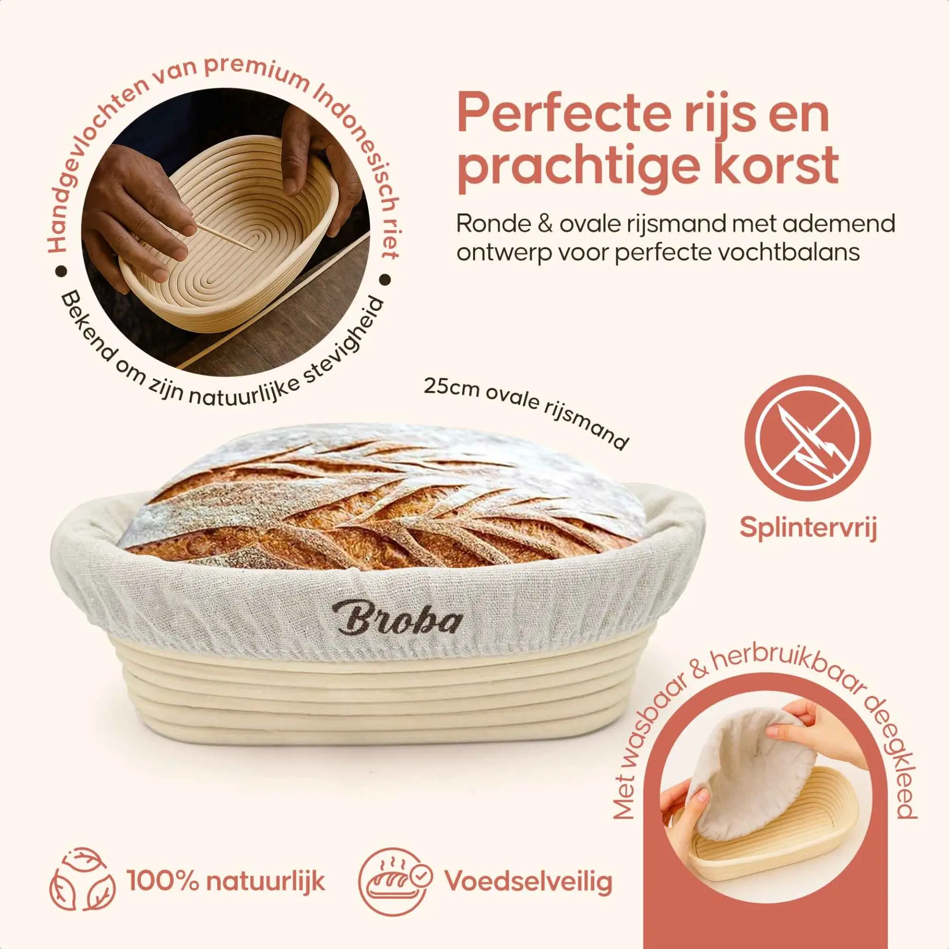 Het mandje is met de hand gevlochten van natuurlijk riet. Dit materiaal ademt van nature, wat zorgt voor een fijne korst en een gelijkmatige rijs van je deeg.