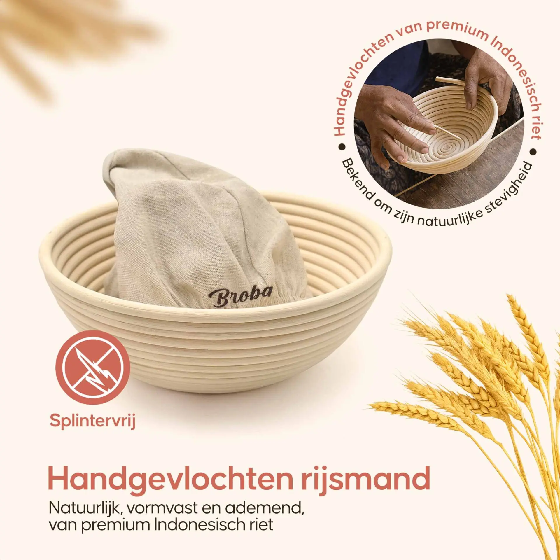 Bij Broba zetten we ons in voor duurzaamheid. Onze rijsmanden zijn gemaakt van natuurlijk riet, wat betekent dat ze biologisch afbreekbaar en milieuvriendelijk zijn. Geniet van kwaliteitsbakken met een schoon geweten.