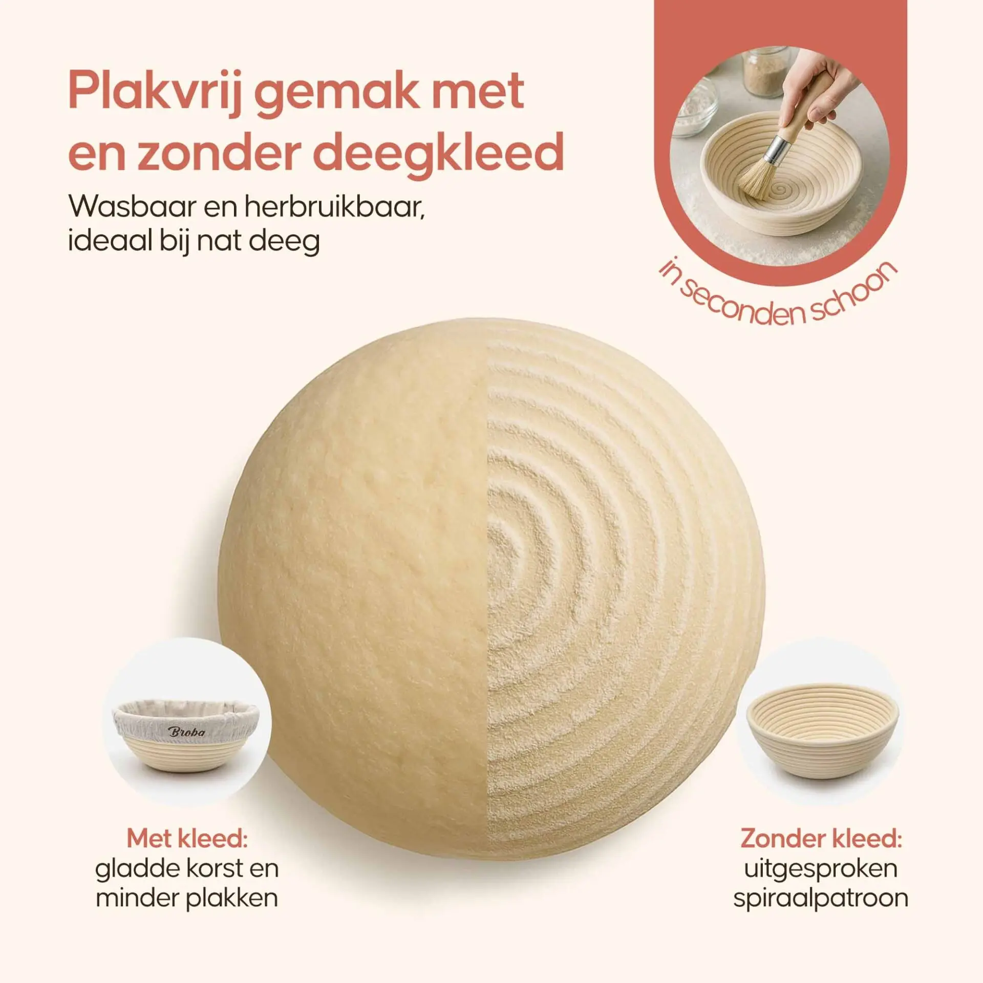 Elk Broba Rijsmandje komt met een hoogwaardig deegkleed, ontworpen voor veelzijdig gebruik. Of je nu kiest voor een gladde afwerking of de voorkeur geeft aan het traditionele patroon dat door het riet wordt achtergelaten, het deegkleed maakt het mogelijk. Het kleed voorkomt niet alleen dat het deeg aan het mandje kleeft, maar maakt ook het reinigen na gebruik een fluitje van een cent. Zo wordt elke bakdag niet alleen een creatieve maar ook een zorgeloze ervaring.