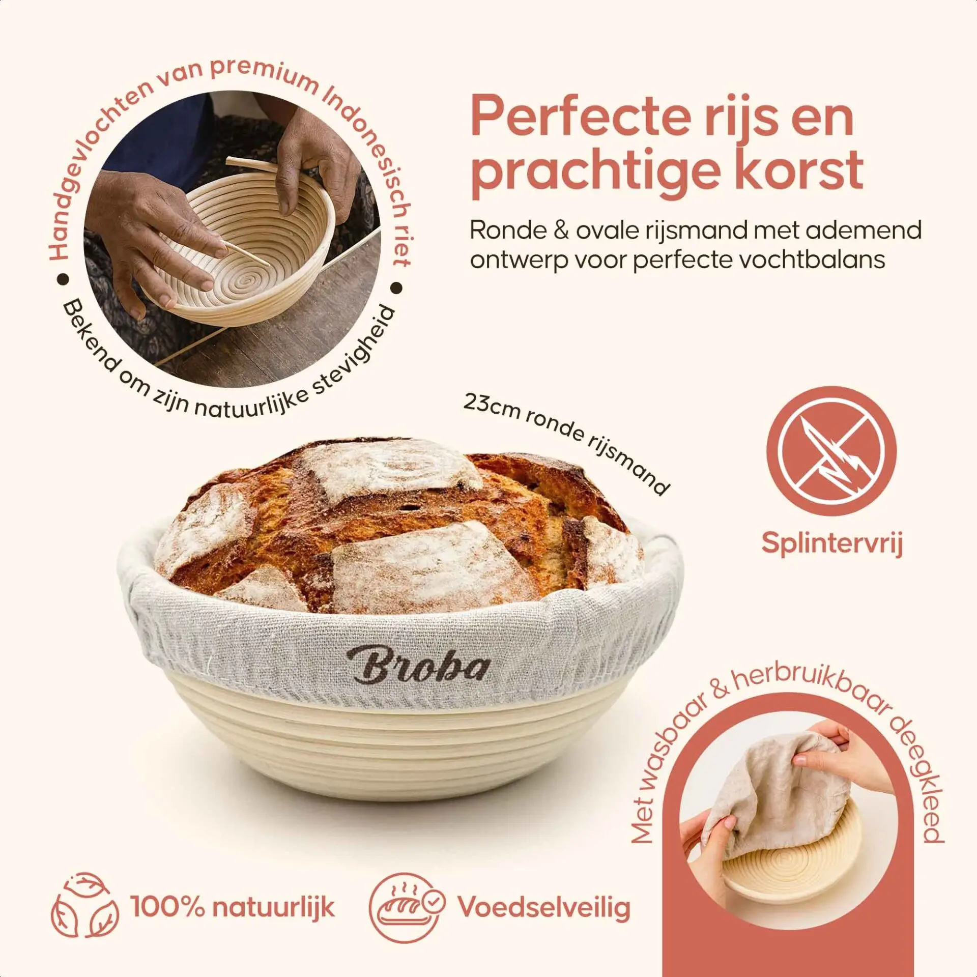 Het mandje is met de hand gevlochten van natuurlijk riet. Dit materiaal ademt van nature, wat zorgt voor een fijne korst en een gelijkmatige rijs van je deeg.